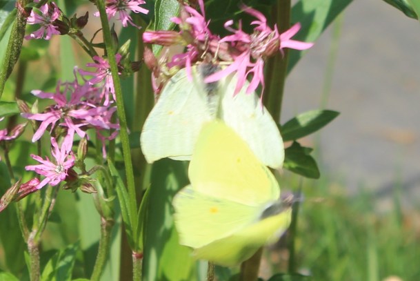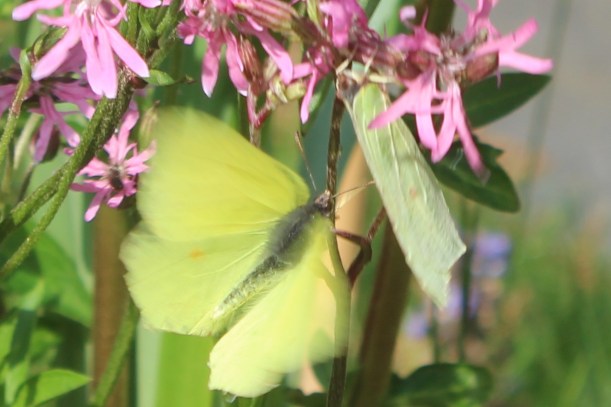en een paartje citroenvlinders in baltsvlucht bij