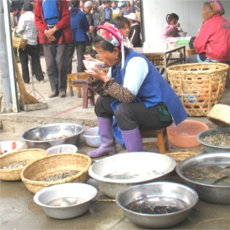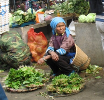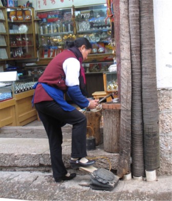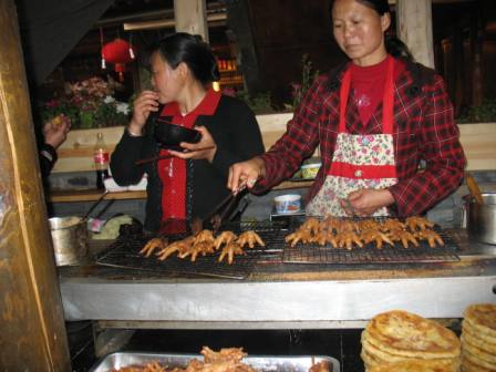 En daarna naar Lijiang, Een tocht van zo'n vier uur door een bergachtige omgeving. Onderweg stopten we om traditionele Bai-koeken te kopen voor de lunch