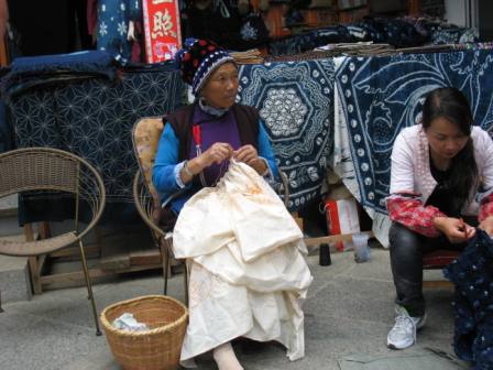 Hier worden blauwwitte Bai-stoffen gemaakt