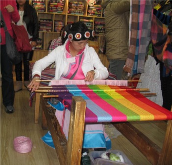 ![]() In lokale Bai-dracht achter het weefgetouw |