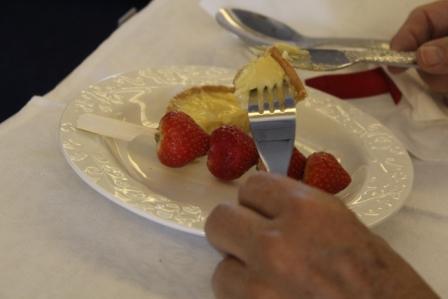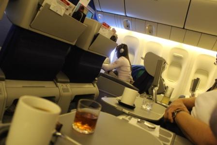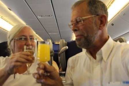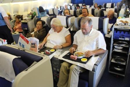 er stond echt "business class" | onze keuze voor het toetje, aardbeien op bamboestokjes | en koffie met cognac (Cees) en cointreau (Marijke) toe |