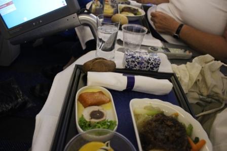 Ons vliegtuig voerde de toepasselijke naam Galápagos Islands | een welkomstdrankje aan boord | en de eerste gang van een heerlijke maaltijd |