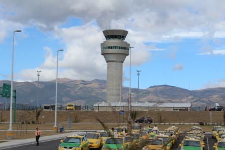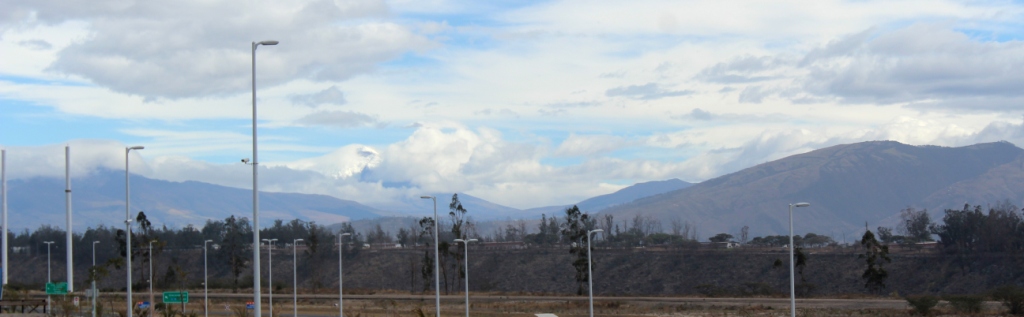 Een prachtig nieuw vliegveld met een statige verkeerstoren | taxiën naar de terminal met zicht op een rij vulkanen in de wolken | berglandschap met de eerste huizen van Quito |