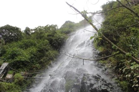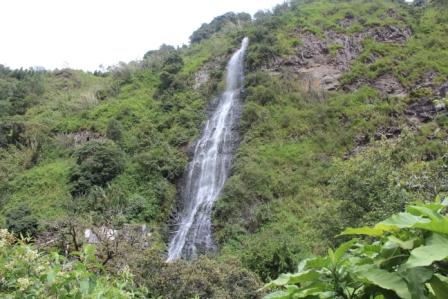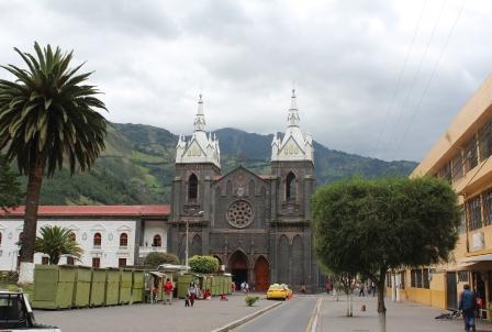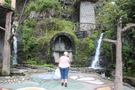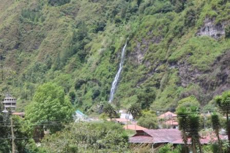het uitzicht vanuit onze hotelkamer met de waterval die het water levert voor een van het thermische bad Agua Santa, wat betekent 'Baden van het Heilige Water'. Hiermee wordt verwezen naar de thermale warmwaterbronnen afkomstig uit de Tungurahua vulkaan. |