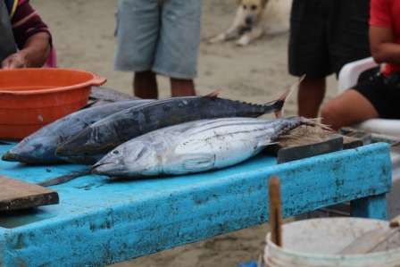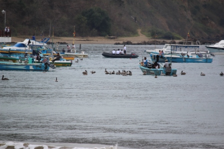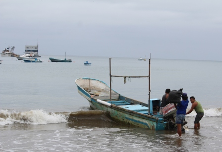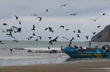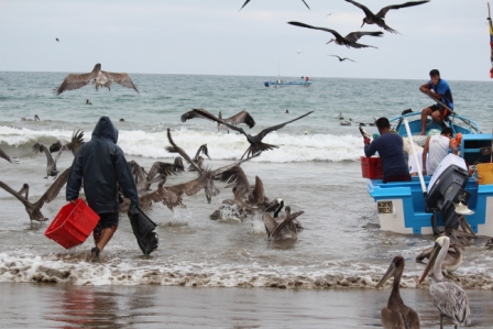de vissersschepen zijn op het strand aangeland | pelikanen en fregatvogels verzamelen zich | de vissers brengen de vangst aan wal |