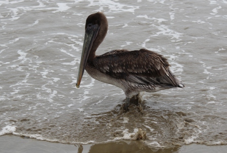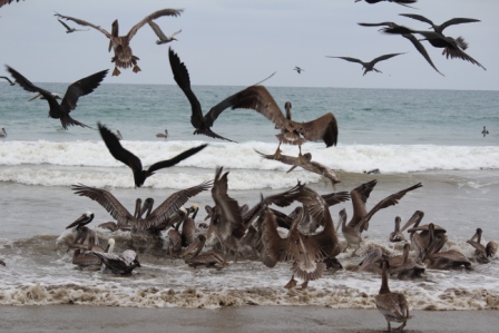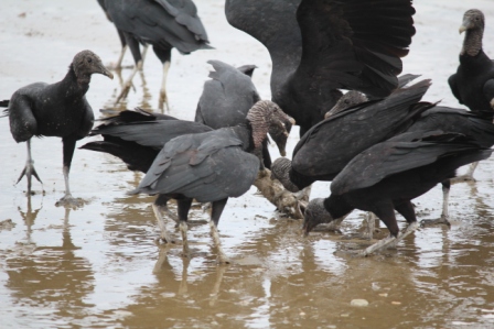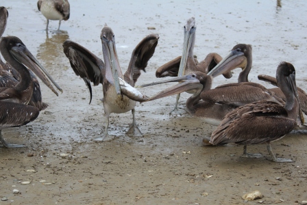De bruine pelikanen vechten om een te grote vis | daarna komen de zwarte gieren de restjes opruimen | de grote zilverreiger wacht op een afstand rustig af of er iets over blijft |