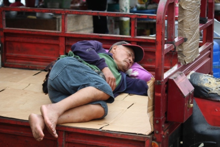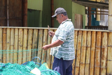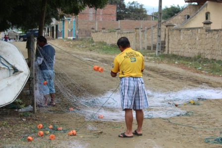 sommige vissers nemen even vrij voor een siësta | anderen zijn druk bezig om de netten te klaren | de rivier kruist de "boulevard" voor hij uitmond in de oceaan |
