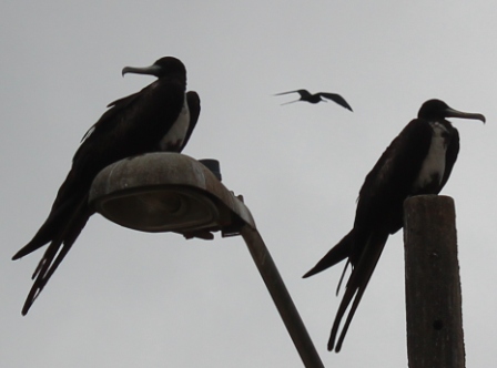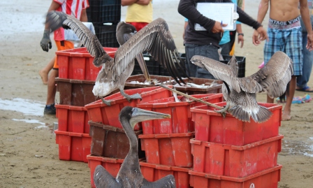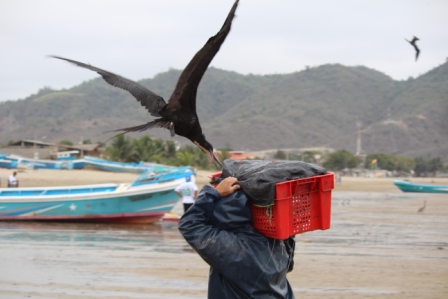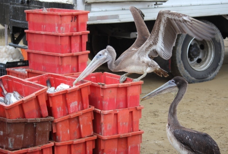 een fregatvogel probeert een vis uit het krat te pikken | ook de pelikanen hebben het op de vis in de kratten voorzien |