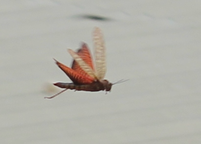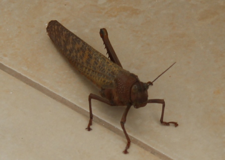 volle zee en een leeg strand | even terug op ons balkon vinden we een sprinkhaan, die prachtig gekleurde vleugels laat zien als hij wegvliegt |