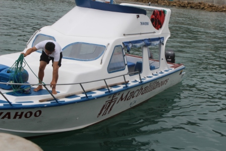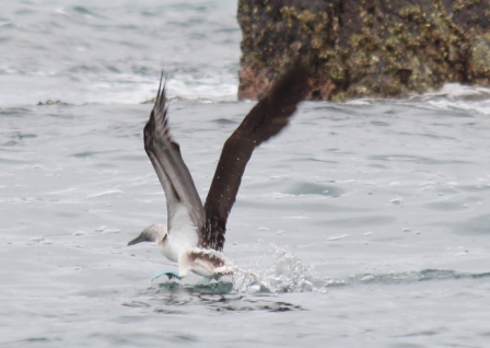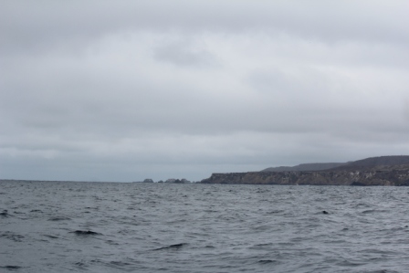 ons bootje meert aan | met twee motoren, 75 pk en 140 pk | we naderen Isla de la Plata (Klein Galapagos of Zilvereiland) |