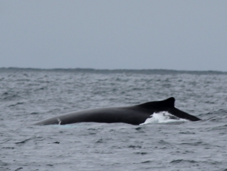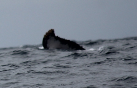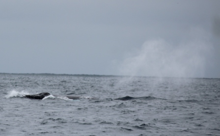 onderweg spotten we een bultrugwalvis, eerst zien we een staart verdwijnen, later zien we weer een waterfontein en komt de bultrug weer boven |
