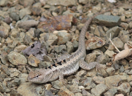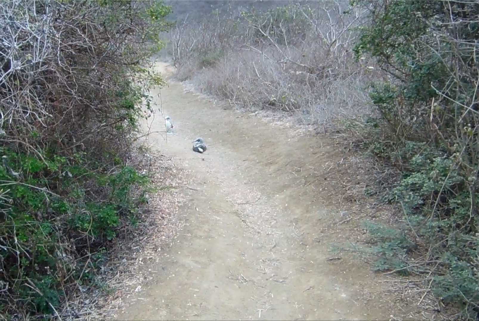 één van de twee hagedis-soorten (Micolophus occipidalis) op het eiland | de Blue-footed booby of Blauwvoetgent broed gewoon op het pad en is een viseter |