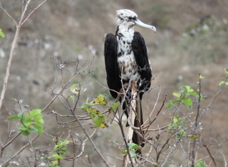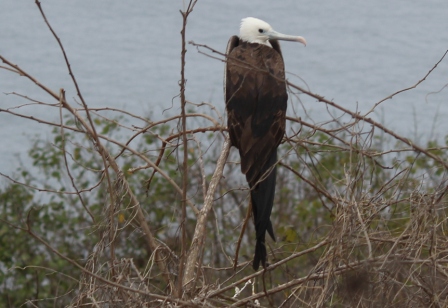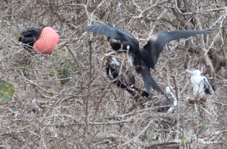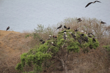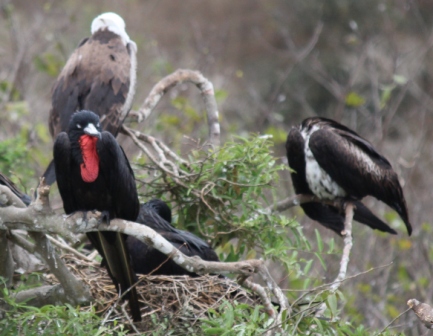 De fregatvogels nestelen in bomen | moeder met jong op het nest | de jonge fregatvogel heeft een witte kop |