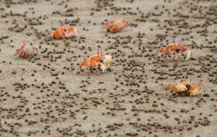 deze cactusbomen zijn karakteristiek op dit eiland | spookkrabben hebben ogen op steeltjes, kunnen erg hard rennen en verdwijnen dan in een gat in de grond. Ze maken zandballetjes bij het zoeken naar voedsel |