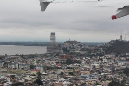 | Vliegveld Guayaquil | we vliegen met de nationale luchtvaartmaatschappy AeroGal | vliegen nog even over de stad, in het midden de oude stad op de heuvel |