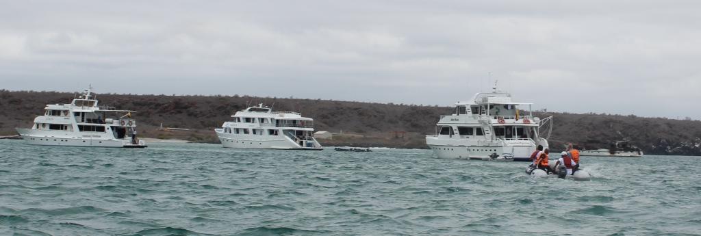 | Voor Baltra liggen de schepen al voor anker, te wachten op nieuwe cruise-passagiers. Nadat iedereen aan boord is geïnstalleerd zullen ze meteen afvaren naar de nieuwe bestemming, voor ons is dat de baai Las Bachas van het eiland Santa Cruz |