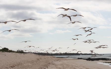 | toen we verder het strand op liepen kwam er een enorme vlucht Blauwvoet Genten die laag over onze hoofden scheerden, waarschijnlijk was het tijd om massaal vis te gaan vangen | ||