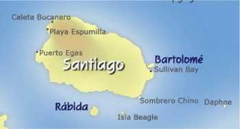 km2 hoogste punt: 114 m Vlak voor de oostkust van Santiago Island (James) ligt het kleine vulkanische eilandje Bartolomé. Via een droge landing kom je op het pad naar de top voor het beroemde uitzicht op de Pinnacle Rock met Santiago en z’n vele vulkaankraters op de achtergrond. Op Bartolomé zelf zijn ook vele kleine vulkaankraters (spatovens) te zien. De andere landingsplaats is op het strand bij de Pinnacle Rock. Lavameeuwen, lavareigers en pinguďns zijn algemeen op de rotskusten en op het strandje achter de groene struiken komen van december tot april soms groene zeeschildpadden aan land om te zonnen. In het heldere water rond de Pinnacle Rock kan goed worden gesnorkeld. Met enig geluk valt hier de Moorish Idol te zien; een van de mooiste vissen uit de wateren van Galápagos. Ook zeeschildpadden en witpuntrifhaaien worden regelmatig waargenomen. |