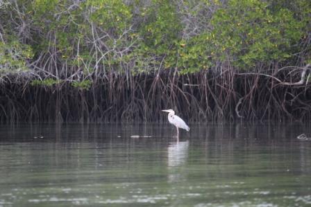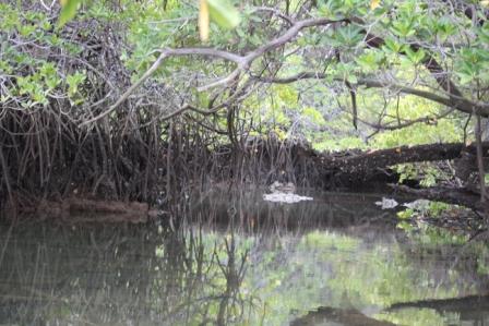 | maar het werd al snel helder. We meerden met de dinqhy af bij de monding van een riviertje aan het eind van de baai, omringd door rode mangroven. Na enige tijd zwommen de waterschildpadden, roggen en rifhaaien vlak langs de boot | ||