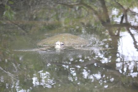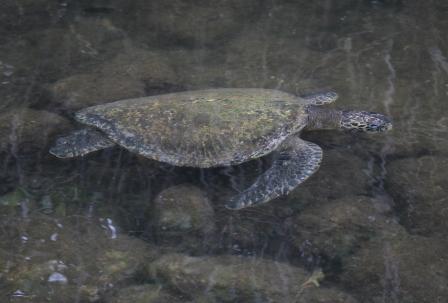 zwommen de waterschildpadden, roggen en rifhaaien vlak langs de