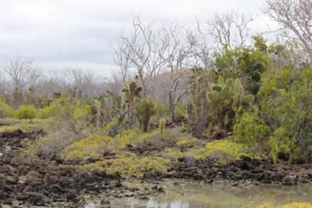 | we komen in een prachtig landschap met lavarotsen en baaien geflankeerd door grote schijfcactussen | ||