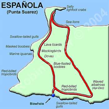 Punta Suarez ligt aan de westkant van het eiland. De route (twee uren)