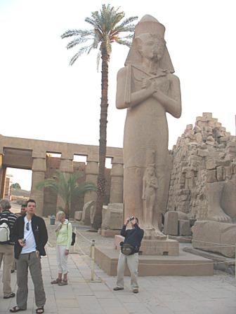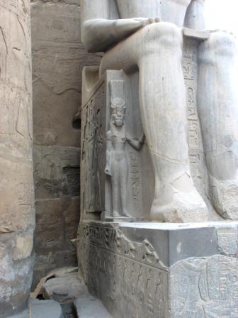 | de heilige scarabee | Marijke in het Hof van Ramses II | Kolossaal beeld van Ramses II (7,20 m hoog) | Aan de voet van Ramses II de afbeelding van zijn vrouw, koningin Nefertari |