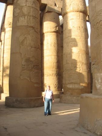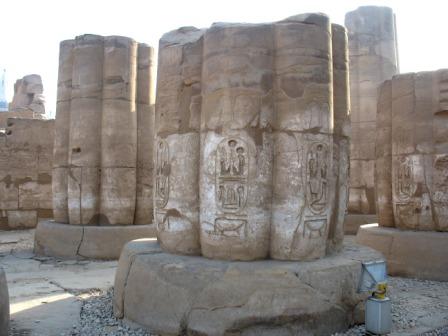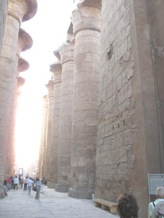 | Deel van de zuilenzaal,de noord-zuidas Karnak, naar de tempel van Moet | De