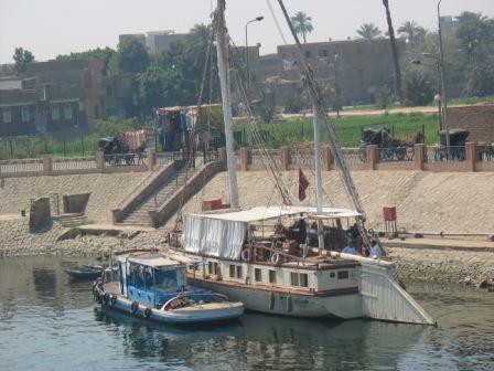 | Grote Felucca met enorm roer en sleepboot langszij |