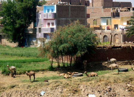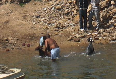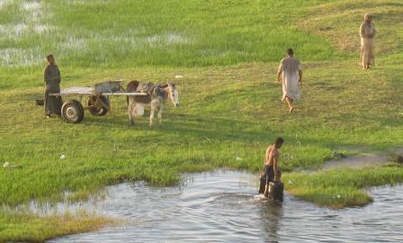 | De stuurman van onze cruiseboot in kleermakerszit | Nijlwater halen met de ezelskar |
