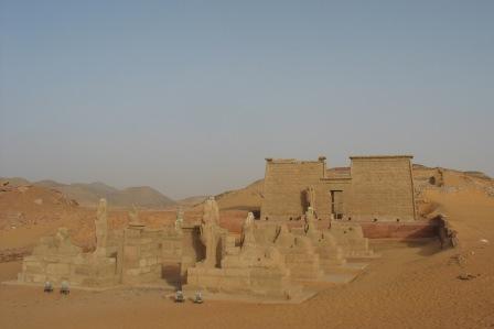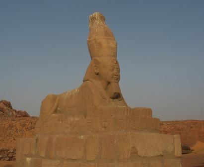 Voor de tempel liggen sfinxen met leeuwenlichamen die de naam aan deze