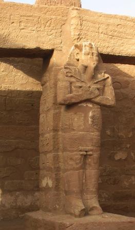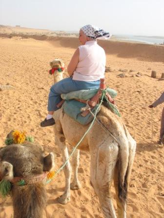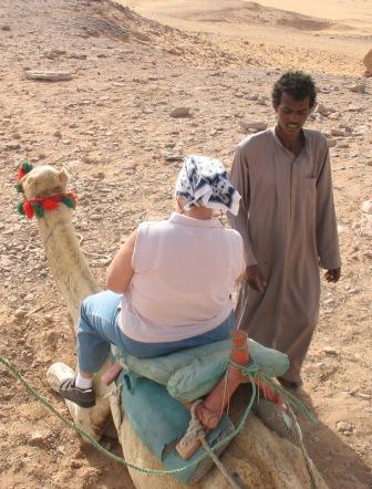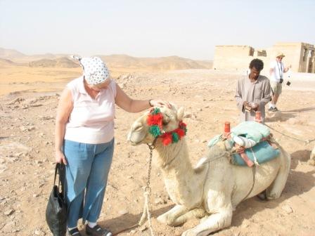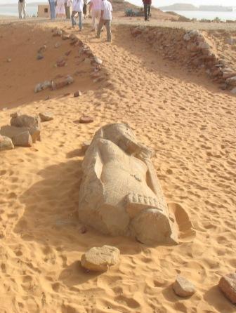 | Per dromedaris op weg naar de volgende tempel | Deze stafdragerfiguur van Ramses II stond oorspronkelijk voor één van de pyloontorens | Afstijgen bij de tempel van El Dakka |