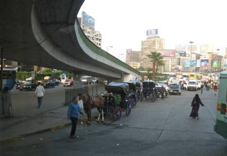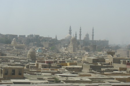 | zicht op het oude Cairo met de citadel van Mohammed Ali | brug over de Nijl | straatbeeld vlak voor ons hotel |