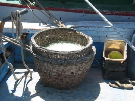 | de houten vissersschepen klaar om uit te varen | vislijn met de haken op de rand van de mand | kind in krat |