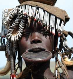 dragen. Het is een primitieve stam, ietwat schuw voor buitenstaanders. Zij vertonen vaak agressief gedrag, en het stokvechten vormt een onmiskenbaar onderdeel van hun cultuur. Voorheen kenden de Mursi geen geldeconomie. Bezit werd veelal gedeeld, of er was sprake van ruilhandel. Totdat de toeristen kwamen, en plots geld boden om foto's te nemen. En met dat geld kan men maar moeilijk omgaan. Over de beroemde lipschotels van klei gaan verschillende verhalen. De grootte van de schotel zou de grootte van de bruidsschat bepalen, of hij zou zijn geïntroduceerd om de interesse van slavenhandelaren te voorkomen. De meeste verhalen kunnen waarschijnlijk naar het land der fabelen verwezen worden. De lipschotel dient vooral om zich te onderscheiden van andere stammen, en omdat de Mursi mannen het gewoon mooi vinden. Ook de Mursi leven vooral van hun vee, en leiden een semi-nomadisch bestaan. De hutjes hebben een ronde vorm, met kleine ingangen. Eigenlijk hebben ze wel wat weg van een iglo. Het dagelijks leven in de dorpjes concentreert zich rond het vee voor de mannen, en rond het maken van eten voor de vrouwen. |