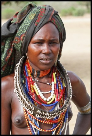 bij de grenzen van Soedan en Kenia. Zij leven in een erg barre omgeving en worden door, uiterste droogte en overstromingen getroffen, met malaria en tseetseevliegen als toemaatje. Maar ze hebben zich, wonderbaarlijk wel, aan deze onherbergzame omstandigheden weten aan te passen. Ze worden wel beschouwd als één van de armste stammen uit de regio, hun vee is hun grootste rijkdom maar door de aanhoudende droogte kunnen zij hun vee nauwelijks in leven houden. Daarom zijn vele stamleden overgeschakeld naar het vissen. De koepelvormige hutjes waarin ze wonen zijn vervaardigd van allerlei materialen - tot plastic en metalen golfplaten toe - op een frame van takken. Het ziet er niet uit, maar deze kunnen in een no-time worden afgebroken en elders worden opgezet, wanneer ze genoodzaakt zijn te verkassen. Veel vrouwen hebben een band, als van een horloge, over het voorhoofd hangen tot over de neusbrug, een stokje door de onderlip en een soort veren hoedje op het voorhoofd Bij deze stam is de besnijdenis van meisjes nog heel normaal. |