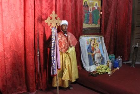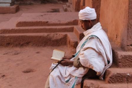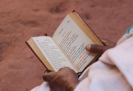 lezende monnik | kijkje in de Amhaarse bijbel | de priester met het traditionele kruis |