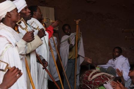 smalle doorgang naar de kerk | de Bete Abba Libanos kerk | gelovigen met drums en rammelaars |