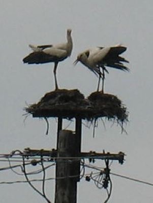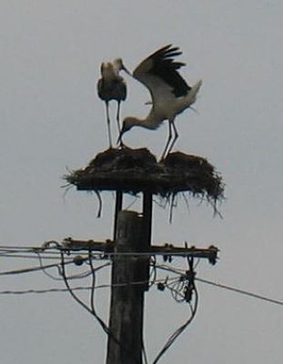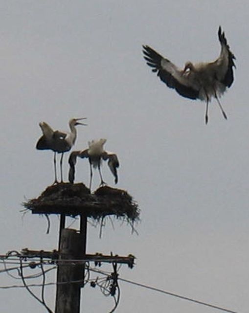 De ooievaars zijn net gearriveerd en moeten het nest nog goedkeuren |