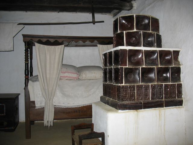 Slaapkamer met hemelbed en tegelkachel