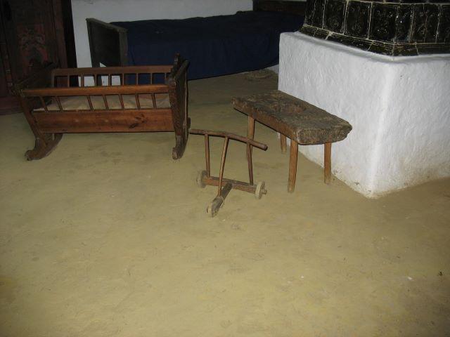 Slaapkamer met tegelkachel, looprek en wieg