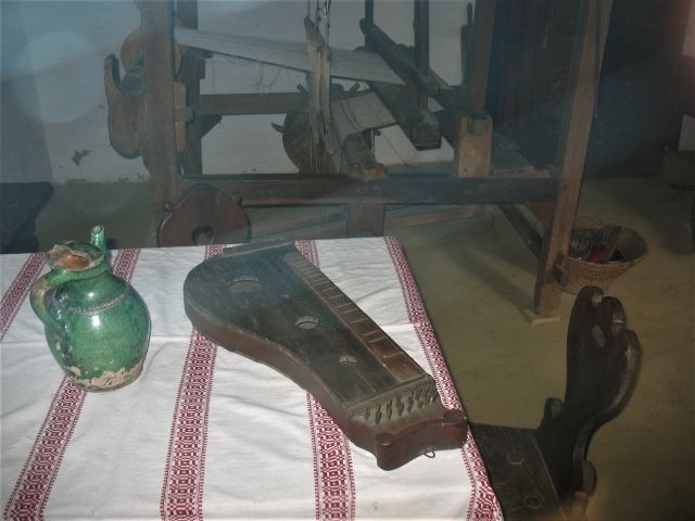 Interieur huiskamer met weefgetouw en de citer ligt op tafel