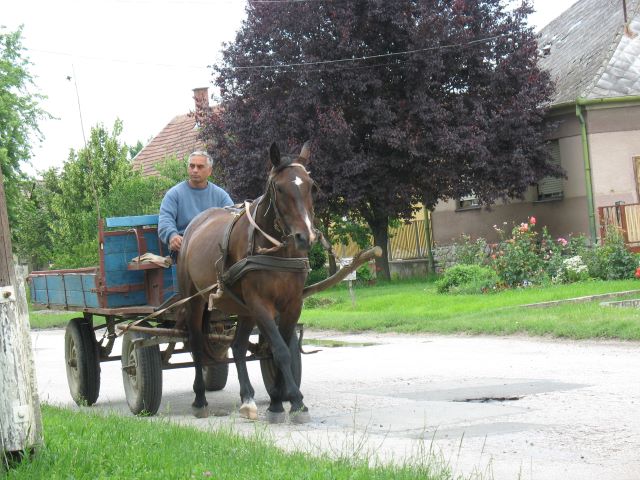 In Magyarmecske zien een de man met een paardenkar waarin hij een houten ploeg vervoerd |