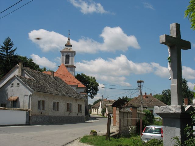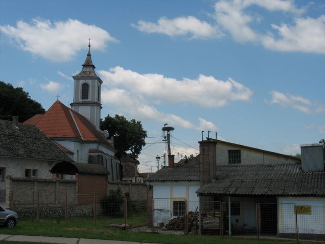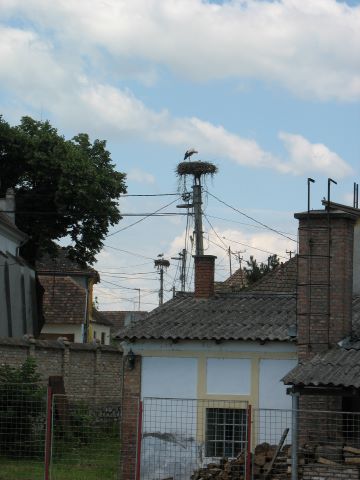 Bata dorpsgezicht met het traditionele, geluksbrengende ooievaarsnest