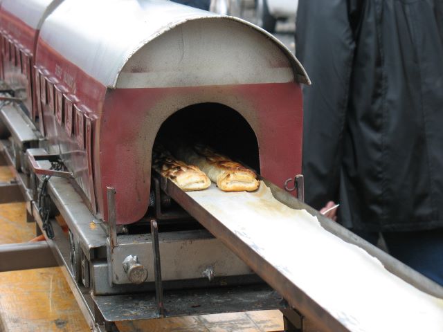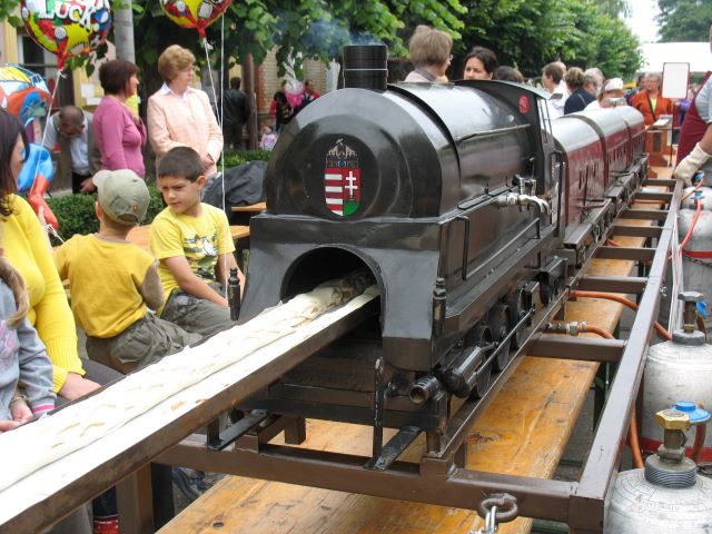 Op het dorpsfeest in Janoshalma wordt een record voor de langste apfelstrudel gevestigd. Het gebak wordt op een lange goot door een oven in een stoomtrein gevoerd |