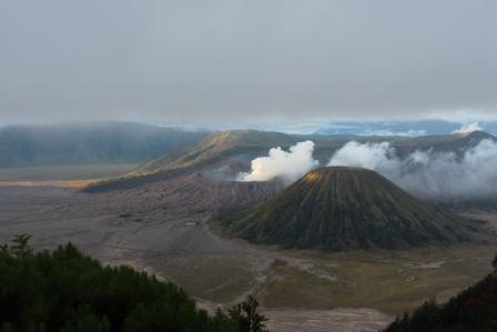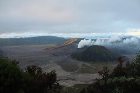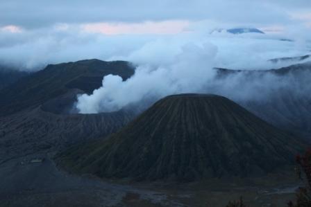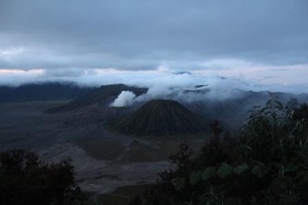 | De Bromo vulkaan (met rookpluim) half verscholen achter de Batok vulkaan, om 5.30 uur net voor zonsopgang | Hier nog wat dichterbij, een kwartiertje later | De lucht kleurt al, achter deze bergen moet de zon tevoorschijn komen, maar de bewolking neemt helaas ook toe |
