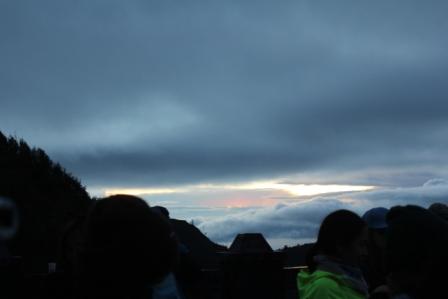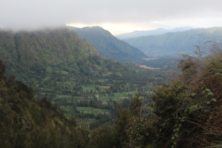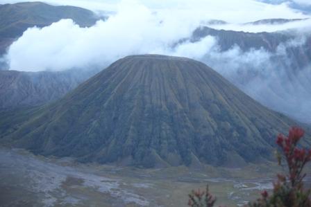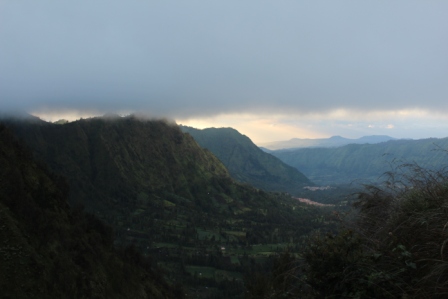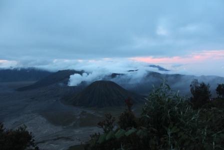 | De bewolking blijft toenemen maar de zon ziet toch nog kans om er af en toe tussendoor te komen | zo krijgen we om half zeven een licht gekleurde top van de Batok vulkaan te zien | dit is het dal links van het Bromo complex |