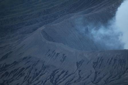 | dan begint ook de lucht achter het vulkanencomplex te kleuren | Aan de voet van de Bromo in de krater van de voormalige Tengger vulkaan is een klooster gevestigd | Close-up van de kraterrand van de Bromo vulkaan |