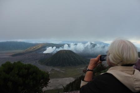 | de Batok vulkaan is gedeeltelijk begroeid en is niet meer actief | Als de zon boven de bergen vandaan komt krijgt de Semeru vulkaan als eerste zonlicht | Marijke filmt het hele proces met verkleumde vingers op de knoppen van de camera |