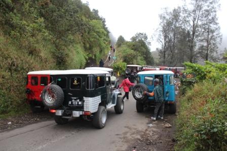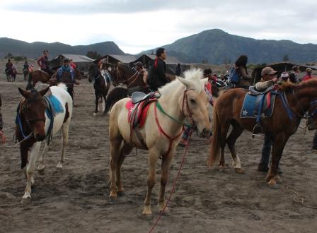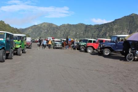 | We vertrekken van onze observatiepost en rijden in colonne naar de voet van de Bromo vulkaan | rijden de krater van wat eens de Tengger vulkaan was binnen en passeren de Batok vulkaan | De bodem is hier bedekt met een dikke laag vulkaanas begroeit met bosjes gras, het lijkt veel op de helmaanplant in de duinen, maar dan op een zwarte ondergrond |